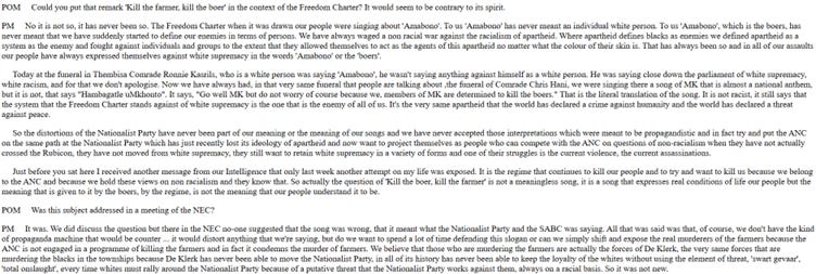 “ 'Kill the boer, kill the farmer' is not a meaningless song, it is a song that expresses real conditions of life our people but the meaning that is given to it by the boers, by the regime, is not the meaning that our people understand it to be.”