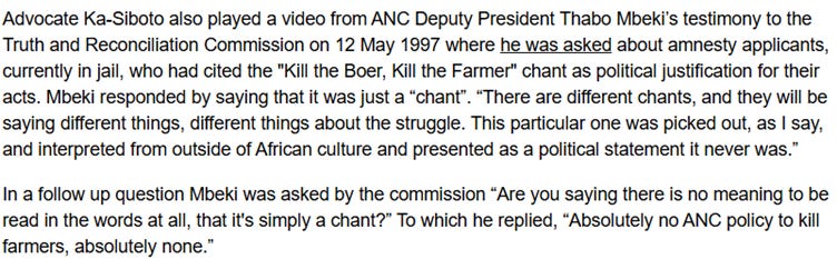 What seems to have happened is these 2 chants “Kill the Boer, Kill the Farmer” and “One Settler, One Bullet” have been merged while their origins and purpose are completely different; its as if the intention of the latter has been imposed in the meaning of the former (chants that is).